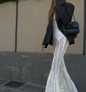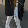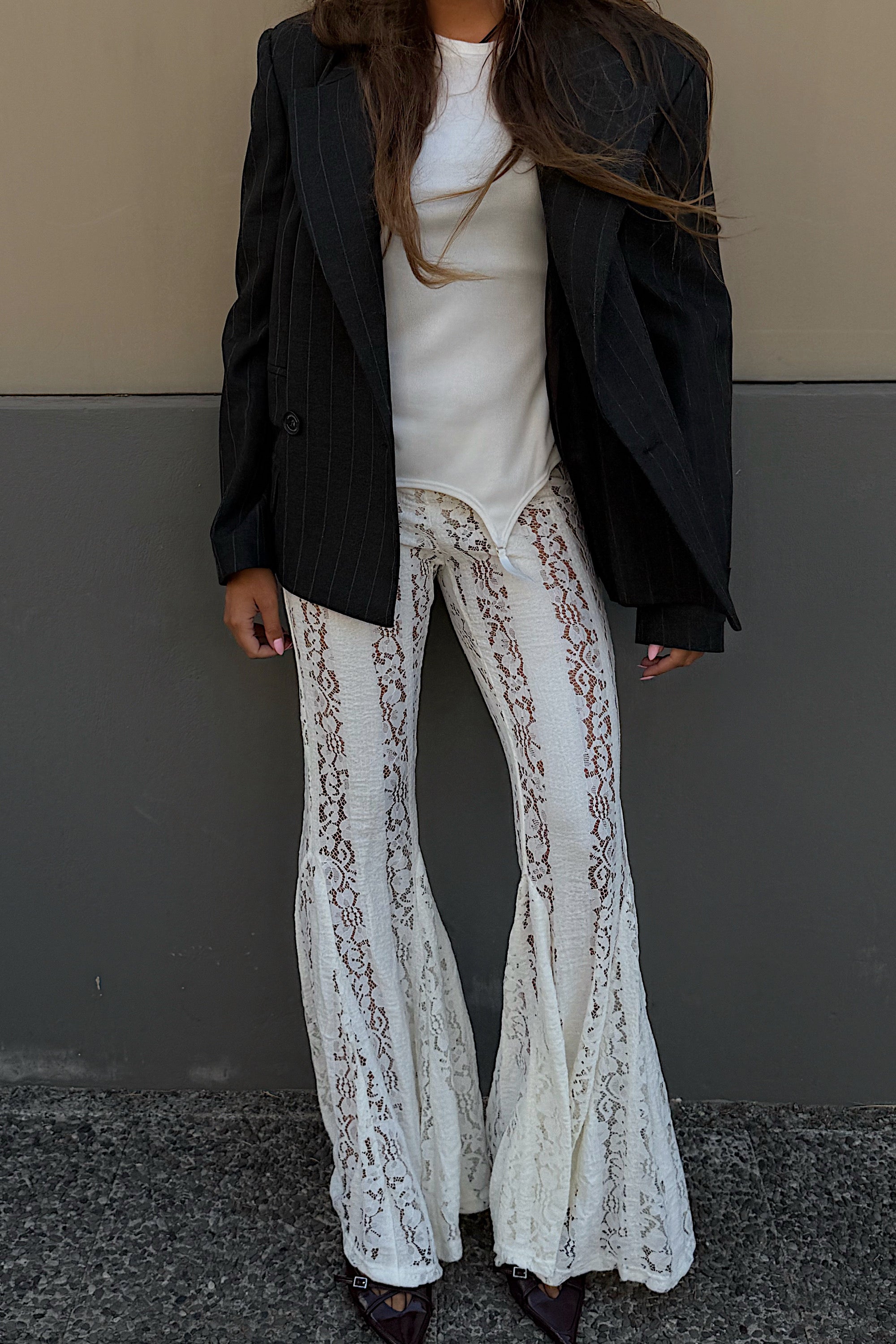 A cropped double-breasted blazer meets lace bell-bottom trousers and a long-sleeve tee. Volumes play with tension, creating a dialogue between softness and structure. This is an ensemble that commands presence while whispering elegance.