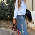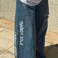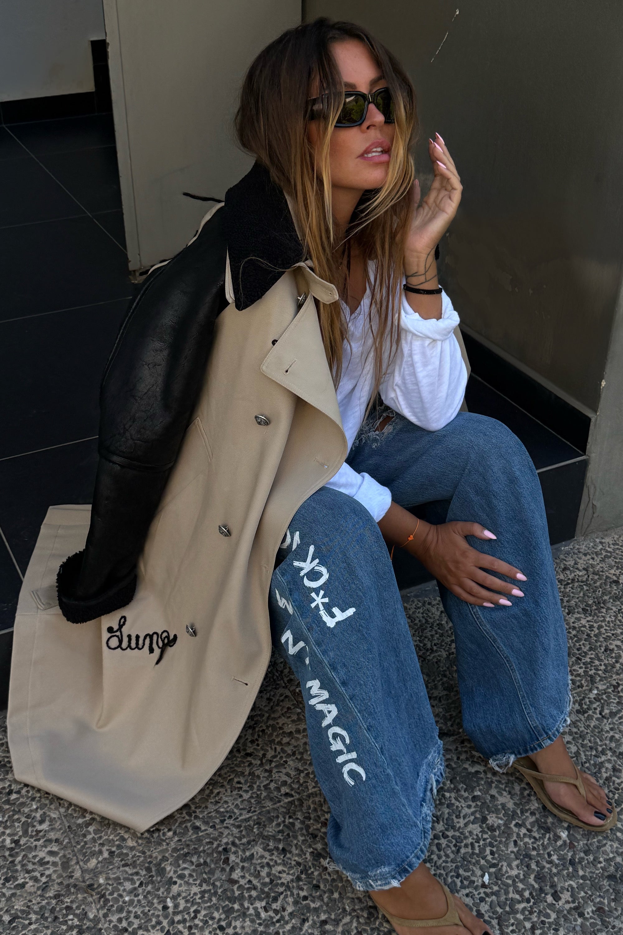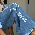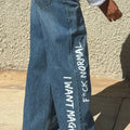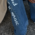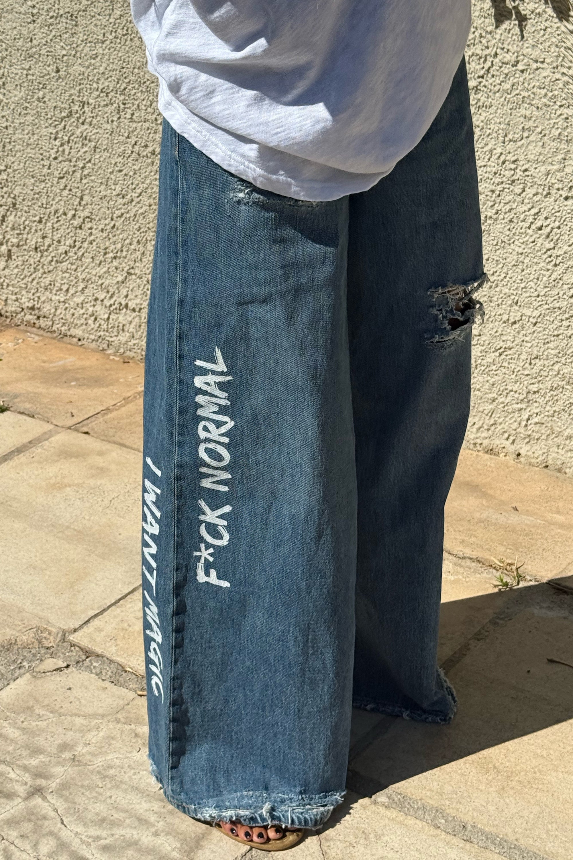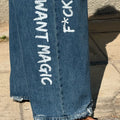 • Unique white screen-printed writing on the leg reading “F*CK NORMAL, I WANT MAGIC” for a bold, edgy statement