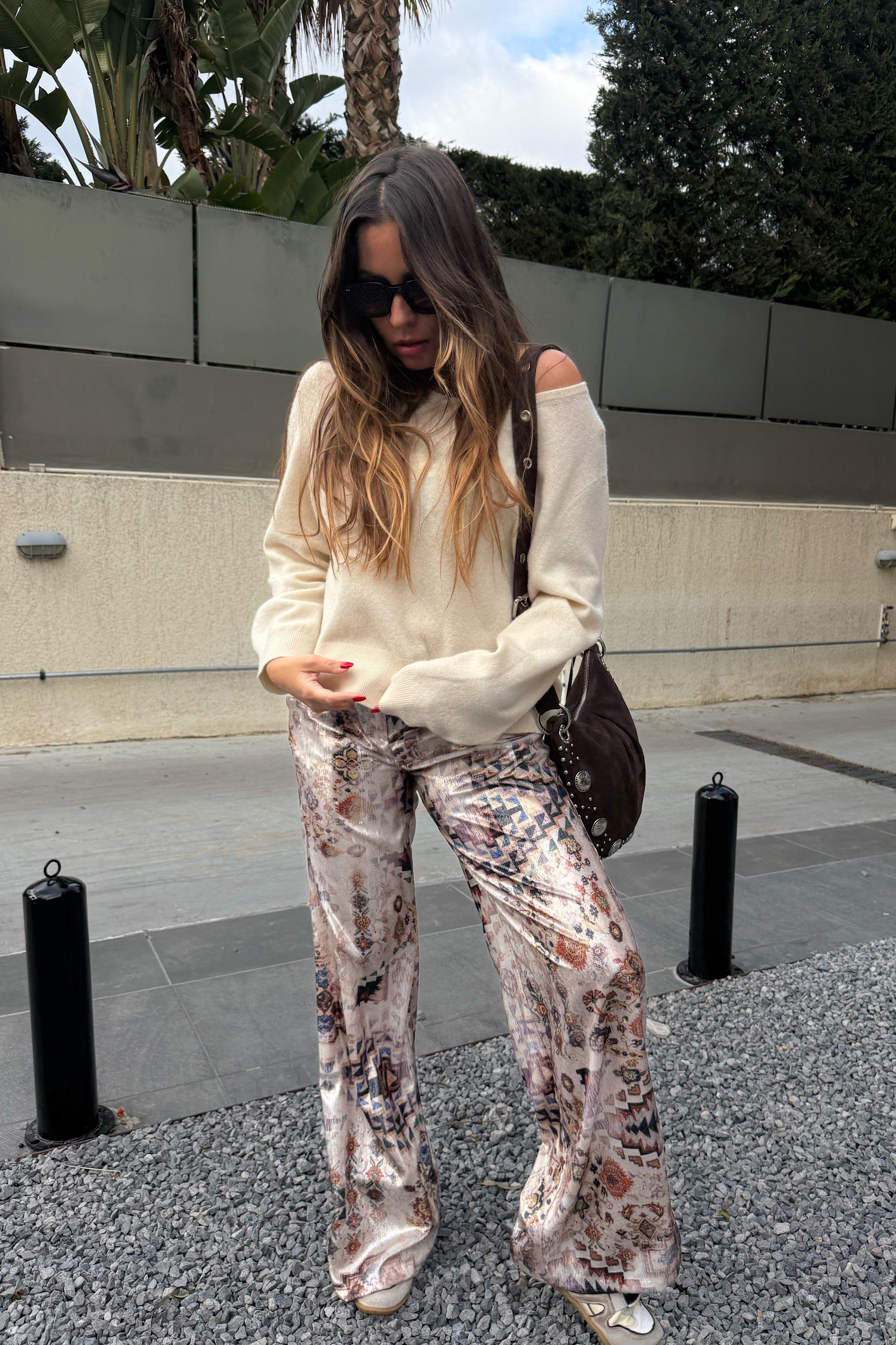Elevate your wardrobe with these High-Waisted Wide-Leg Pants in Printed Velour, showcasing a fusion of vintage glamour and modern trends. Let these pants reflect your unique style and capture the essence of understated elegance.