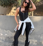This bodycon jumpsuit exudes modern athletic elegance with a bold, confident attitude. Designed to move seamlessly from streetwear to evening looks, it elevates minimal styling into a statement. A contemporary essential that fuses sport-inspired energy with chic sophistication.