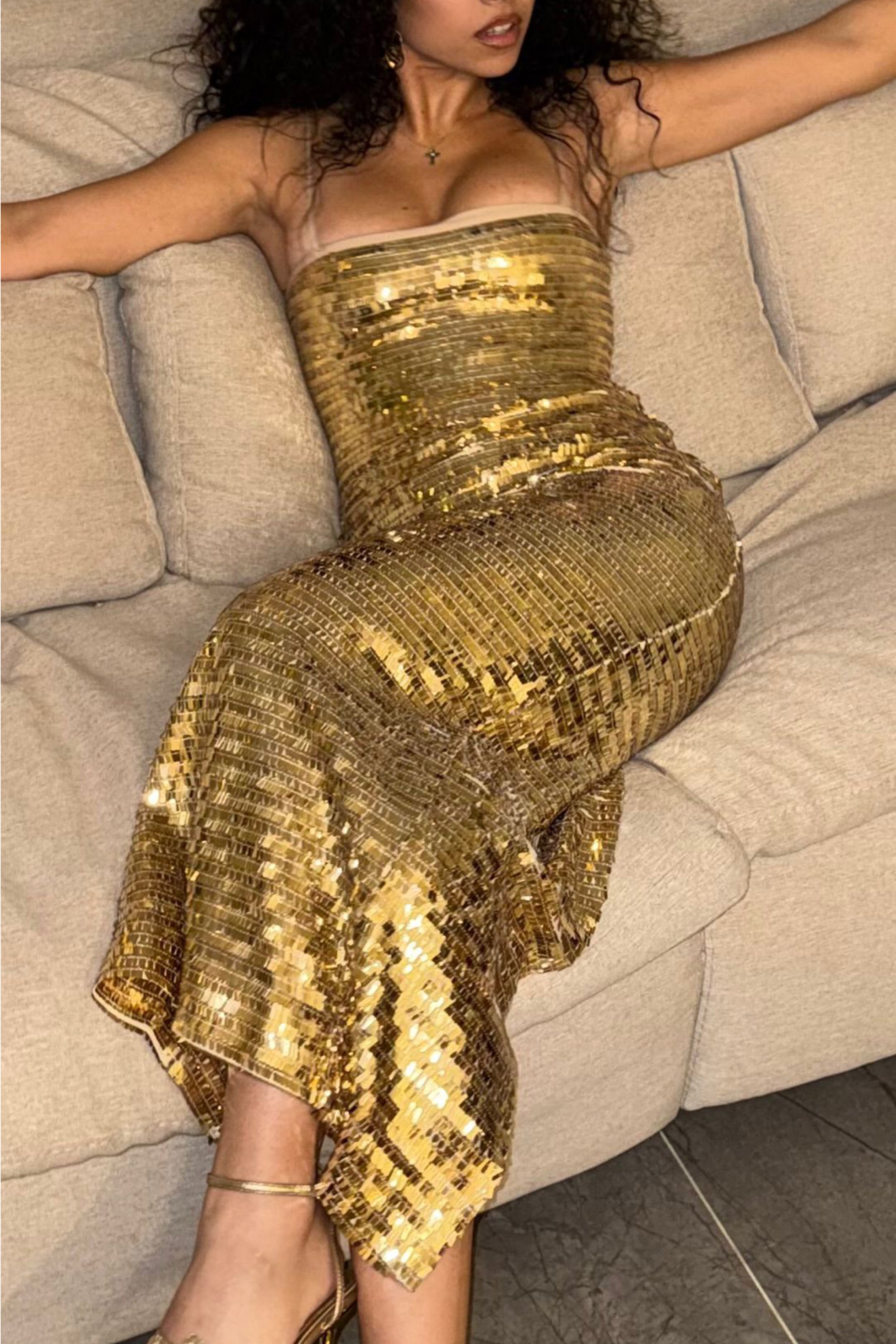 This maxi dress is a striking statement piece designed for unforgettable party moments. Its refined glamour and confident shine make it the ultimate choice for elevated evenings and celebrations. Perfect for when you want to stand out with effortless sophistication.