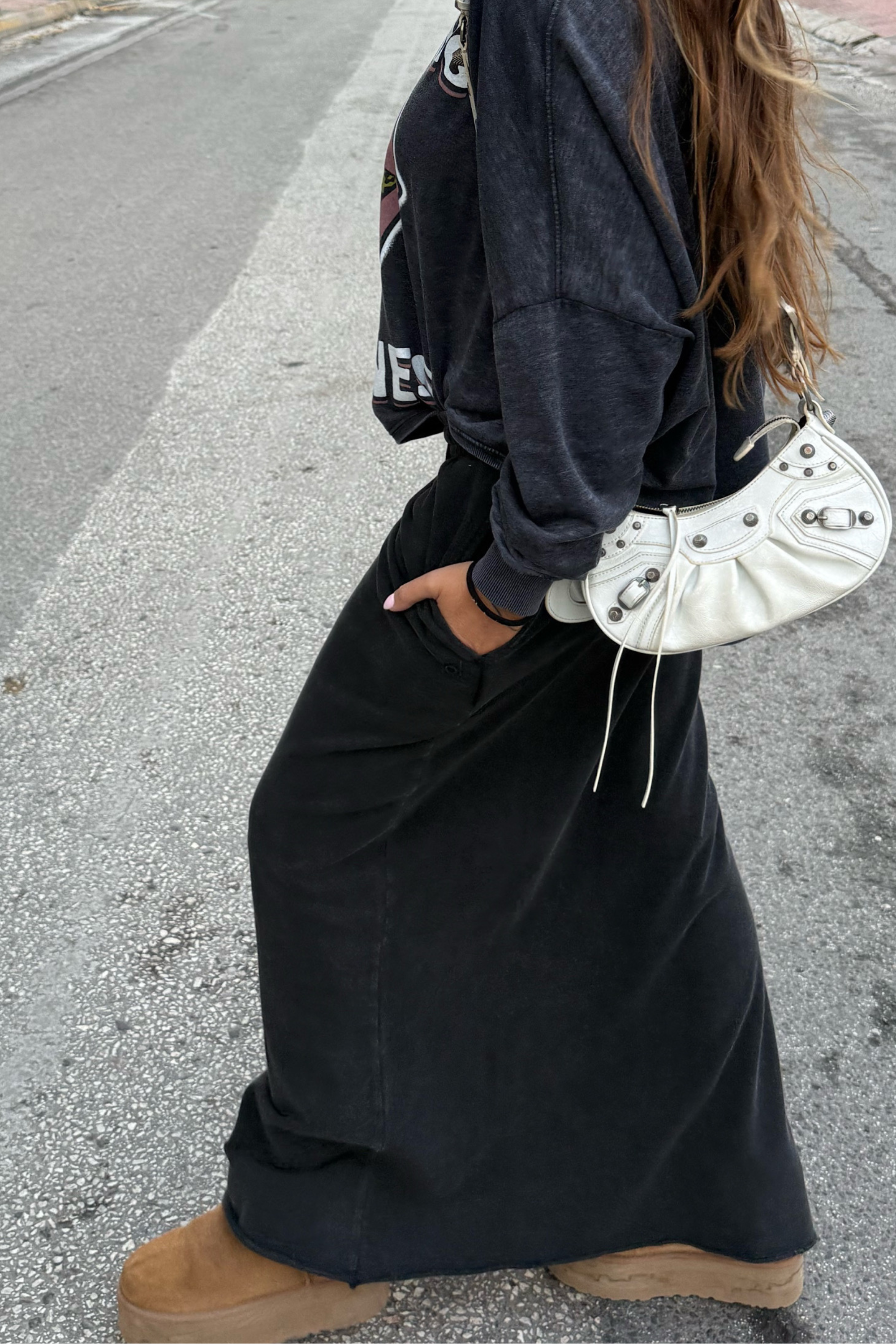 A midi skirt designed with an effortless, off-duty attitude. It blends comfort and cool in a way that feels relaxed yet intentional, making it an easy go-to for modern everyday styling. A quiet statement piece that works across seasons.