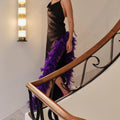 - Available in three enchanting combinations: the first option features a classic black satin paired with matching black feathers, creating a timeless and sultry aesthetic. The second option combines the richness of black satin with royal purple feathers, adding a regal touch to your ensemble. For a more whimsical and romantic look, the third option presents a delicate pink satin gown adorned with matching pink feathers, exuding a soft and feminine charm