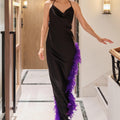 Whichever combination you choose, this gown promises to make a statement at any special occasion. It is not just a dress; it's a manifestation of individual style and a celebration of the wearer's unique elegance. Embrace the luxurious feel of satin, the playful touch of feathers, and the versatility of three distinctive color combinations, ensuring you stand out as the epitome of grace and glamour.