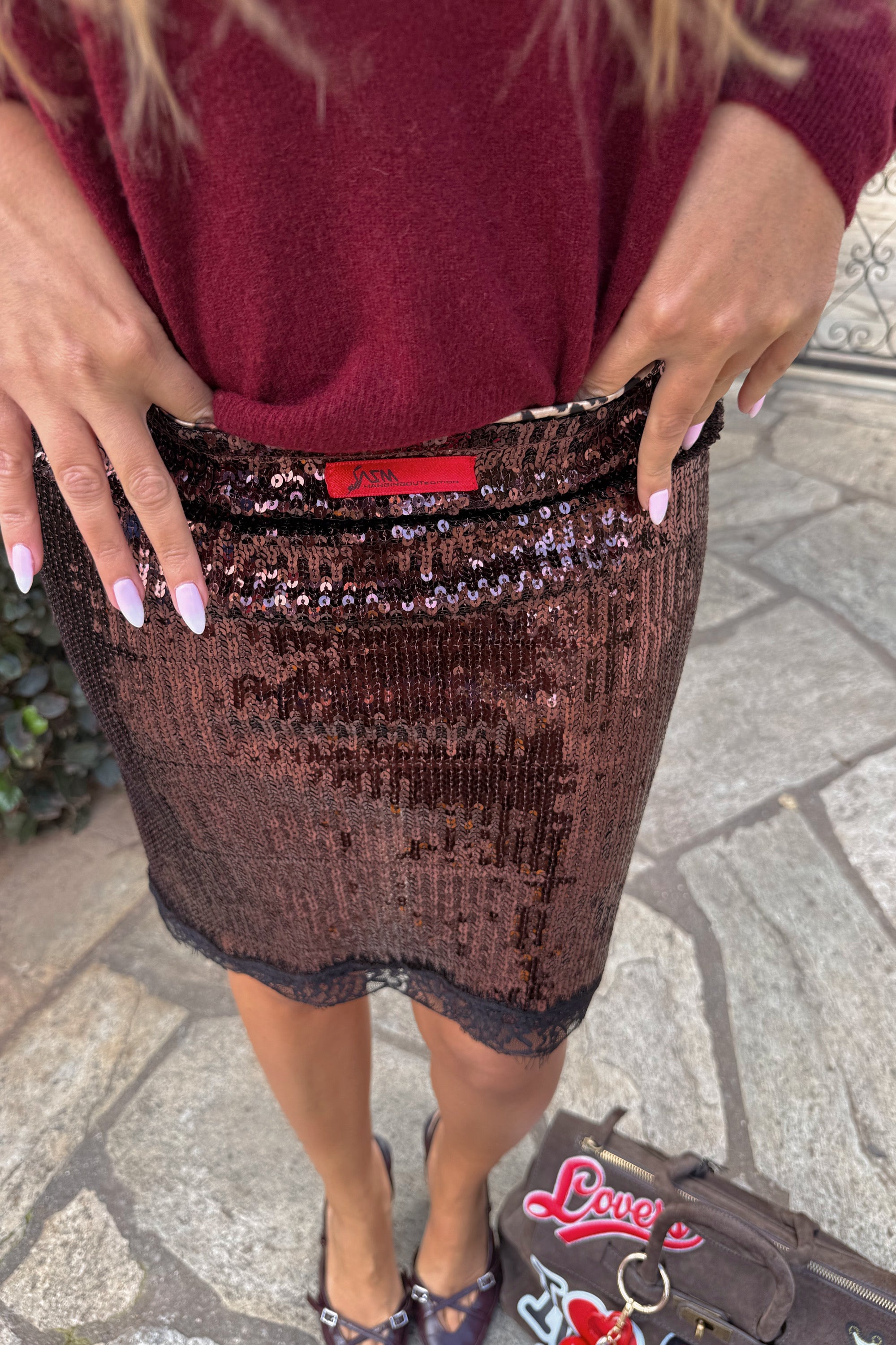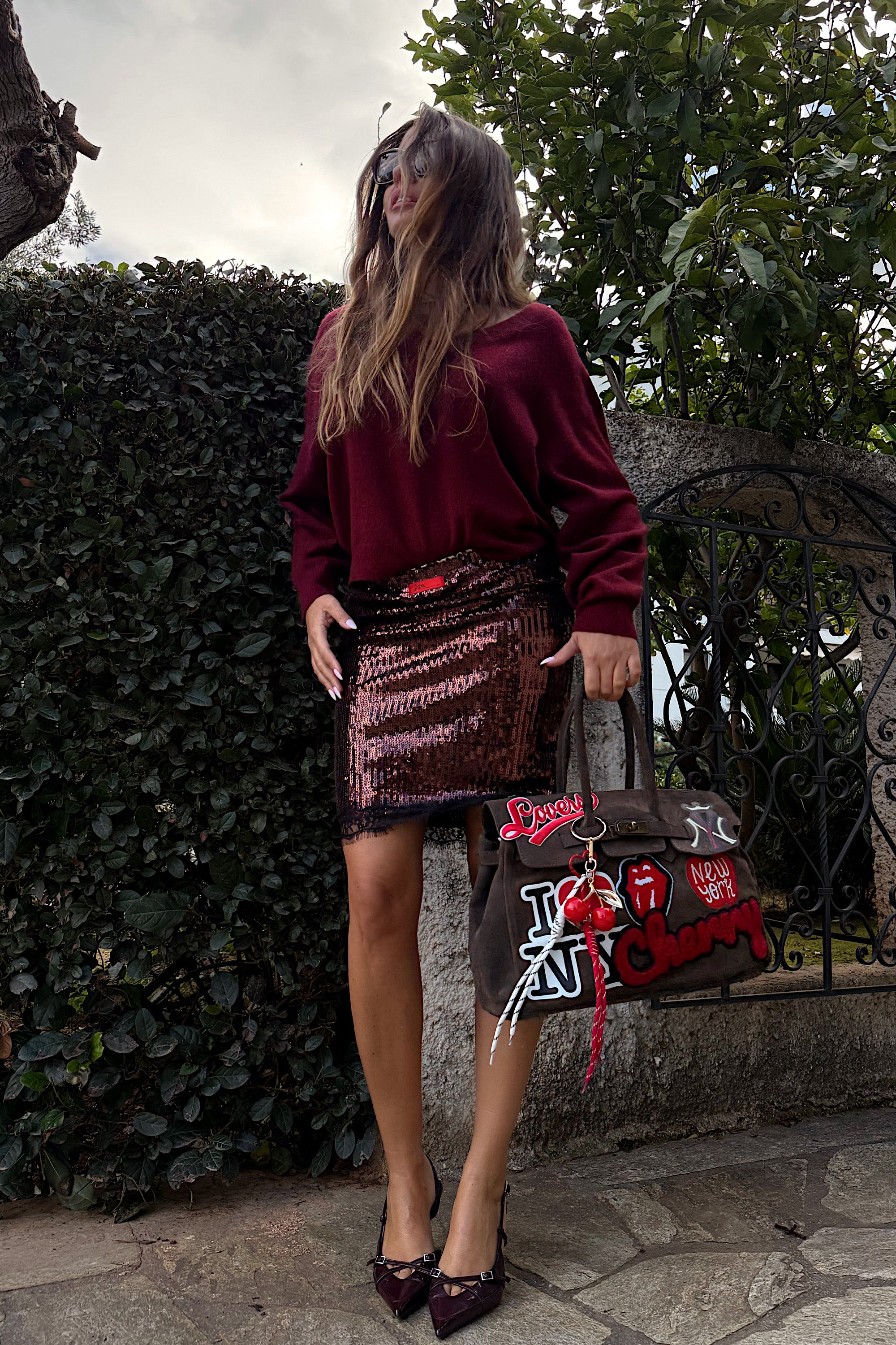 Rich burgundy meets a shimmer of contrast, softened by playful accents. Texture and tone move in harmony, balancing polish with personality. A look that feels refined, expressive, and effortlessly composed.