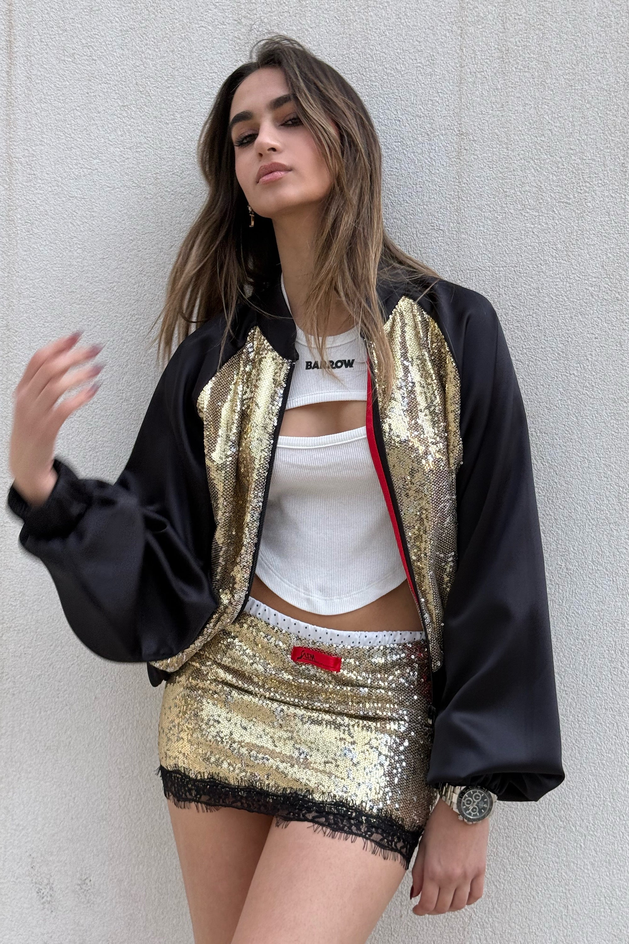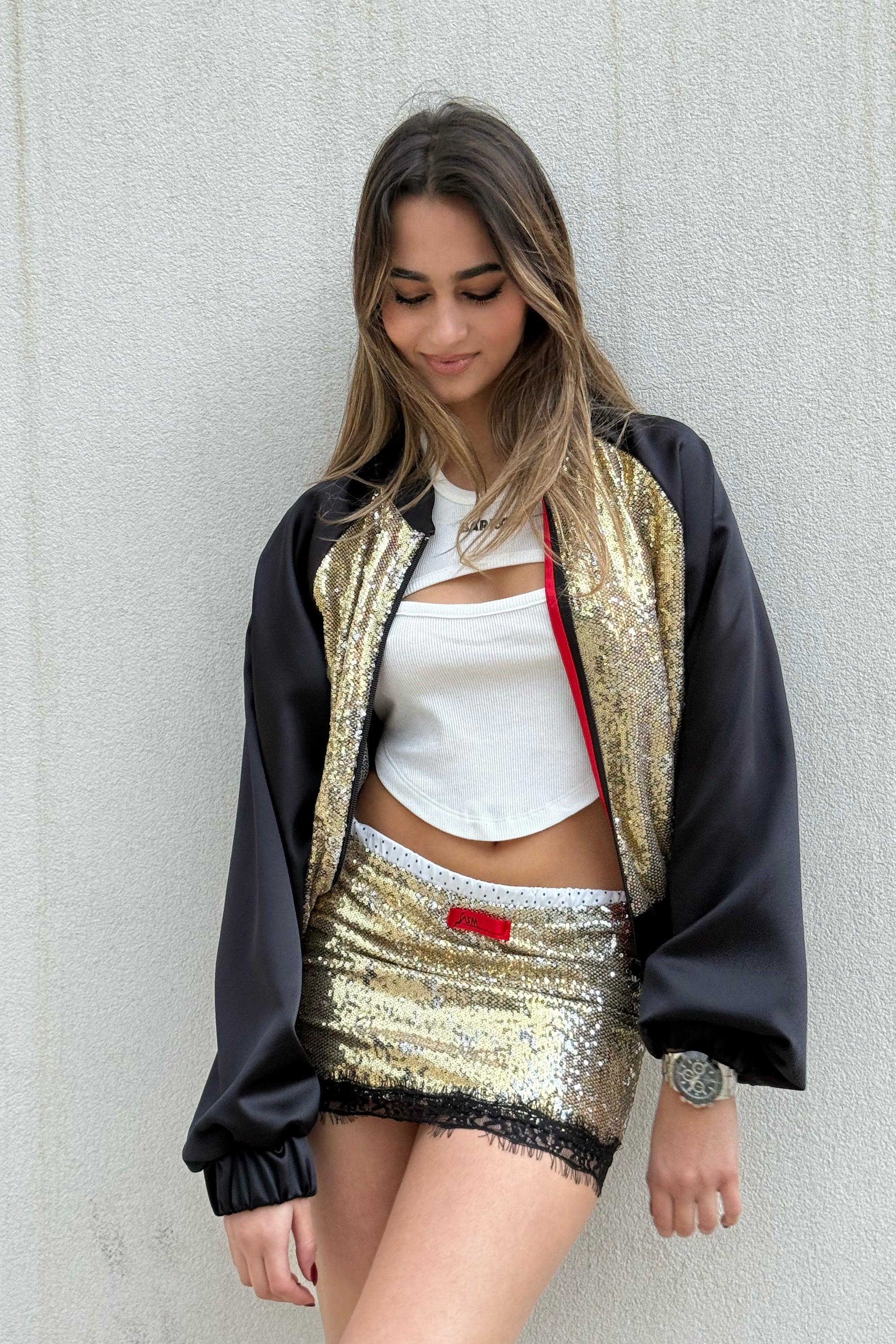 A dazzling gold sequin mini skirt paired with a matching bomber jacket creates a bold, head-turning statement, while sleek black satin sleeves add a luxe contrast and modern edge. The set blends high-shine glamour with sporty structure for a look that’s equal parts fierce and fashion-forward.