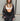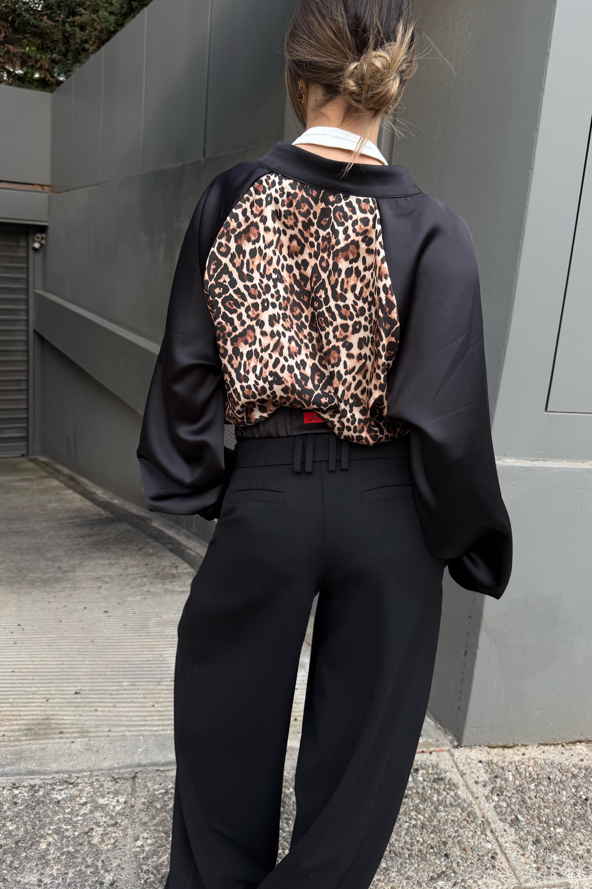 A satin black and leopard bomber jacket adds a bold, street-luxe edge to this look, layered over a crisp white ribbed tank for effortless contrast. Tailored trousers with detachable corsetry sculpt the silhouette, blending sharp structure with statement-making versatility.